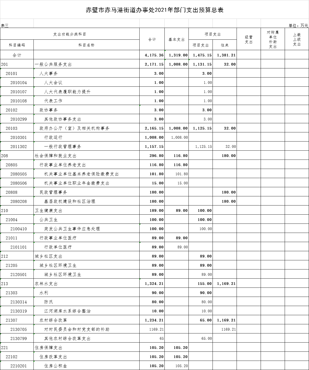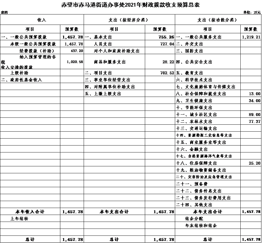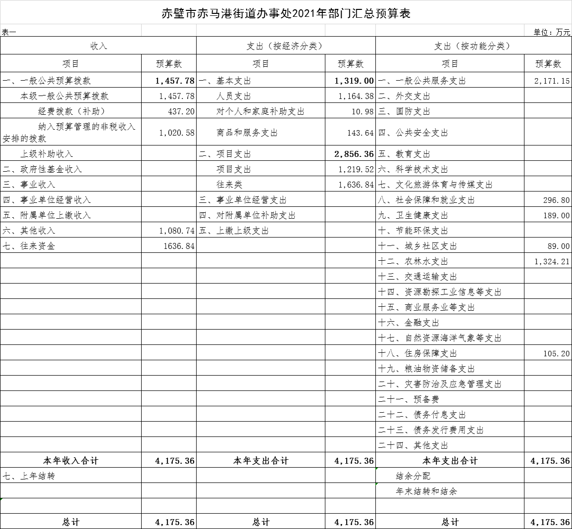 按照预算管理规定,赤壁市赤马港街道办事处2021年部门预算的编制实行综合预算制度,所有收入和支出均纳入部门预算管理。收入包括:一般公共预算收入、政府性基金预算收入、专户管理的事业收入、其他资金、单位往来资金、上年结转资金;支出包括:一般公共服务支出、社会保障和就业支出、卫生健康支出、住房保障支出、城乡社区支出、农林水支出等。赤壁市赤马港街道办事处2021年收支总预算4175.36万元。