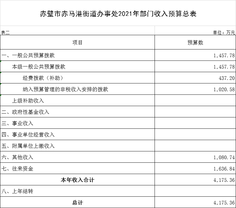 赤壁市赤马港街道办事处2021年收入预算4175.36万元,其中:财政拨款收入1457.78万元(含非税收入1020.58万元),占34.9%;政府性基金预算收入0万元,占0%;专户管理的事业收入0万元,占0%;其他资金1080.74万元,占25.9%;单位往来资金1636.84万元,占比39.2%;上年结转0万元,占0%。
