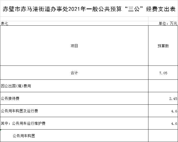 本预算反映部门年度“三公”经费预算情况。赤壁市赤马港街道办事处本年“三公”经费预算支出中,因公出国(境)费支出0万元,占“三公”经费的0%;公务用车购置及运行费支出4.6万元,占“三公”经费的65.3%;公务接待费支出2.45万元,占“三公”经费的34.7%。具体情况如下: