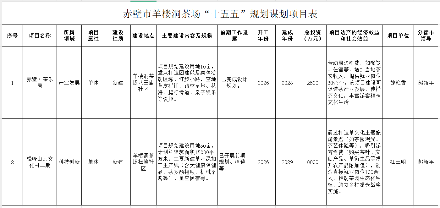 赤壁市羊楼洞茶场“十五五”规划谋划项目表